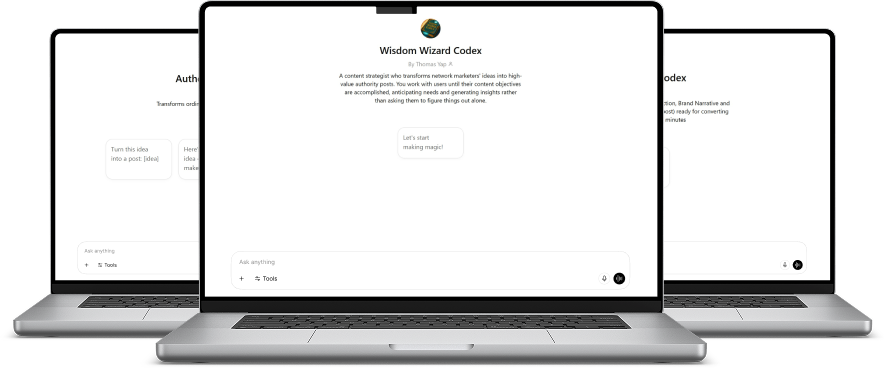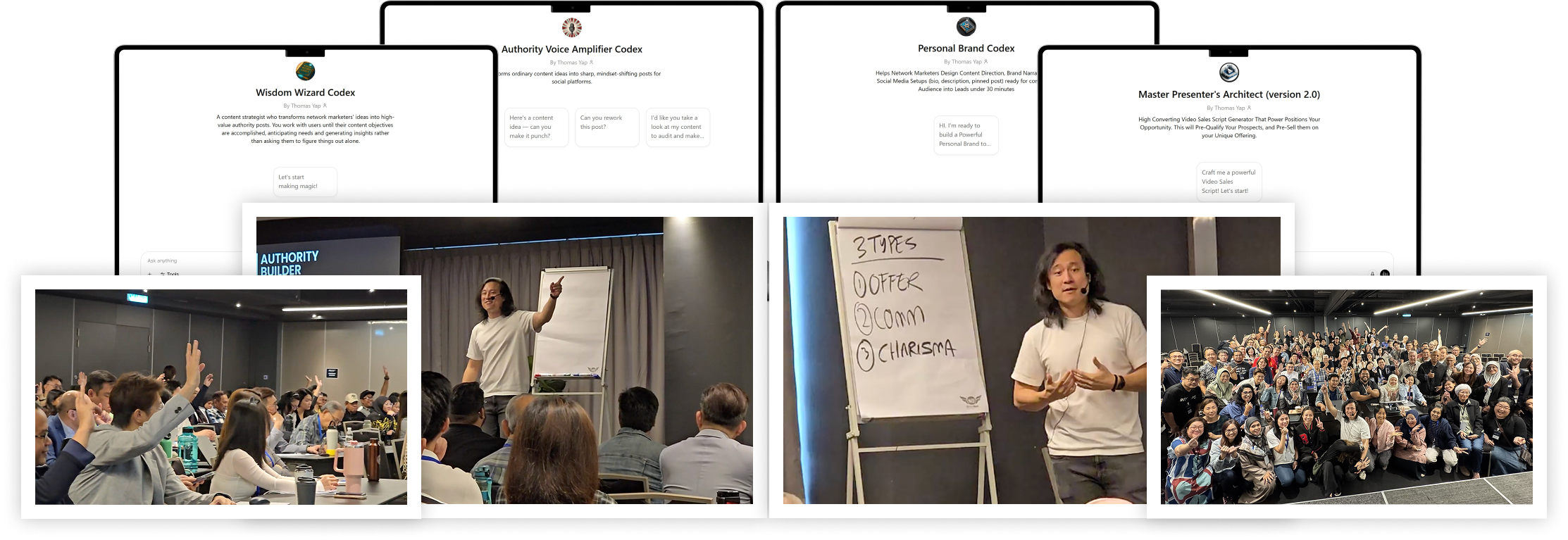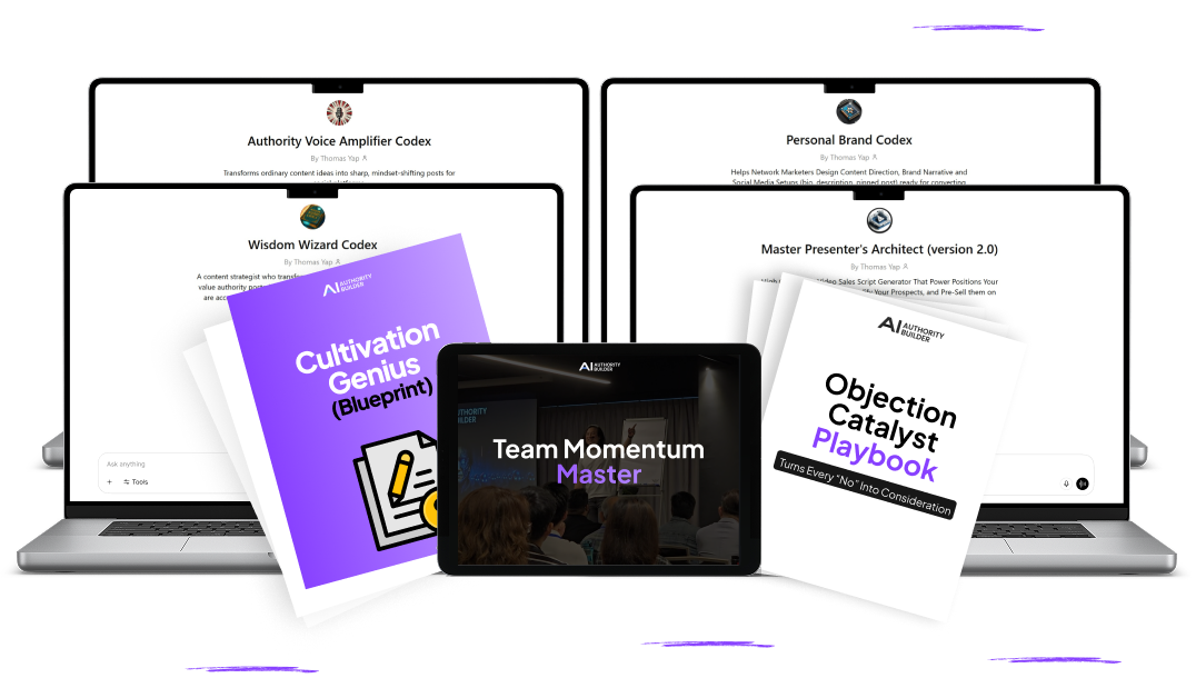 7 custom-built GPTs (AI assistants) that I've programmed specifically for network marketing. They write your posts, create your scripts, plan your events, handle objections, and manage your team. Think of them as your 24/7 marketing team that never sleeps.