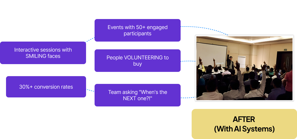 10-20 qualified prospects reaching out to YOU weekly. Events that fill themselves. Teams that duplicate without hand-holding.