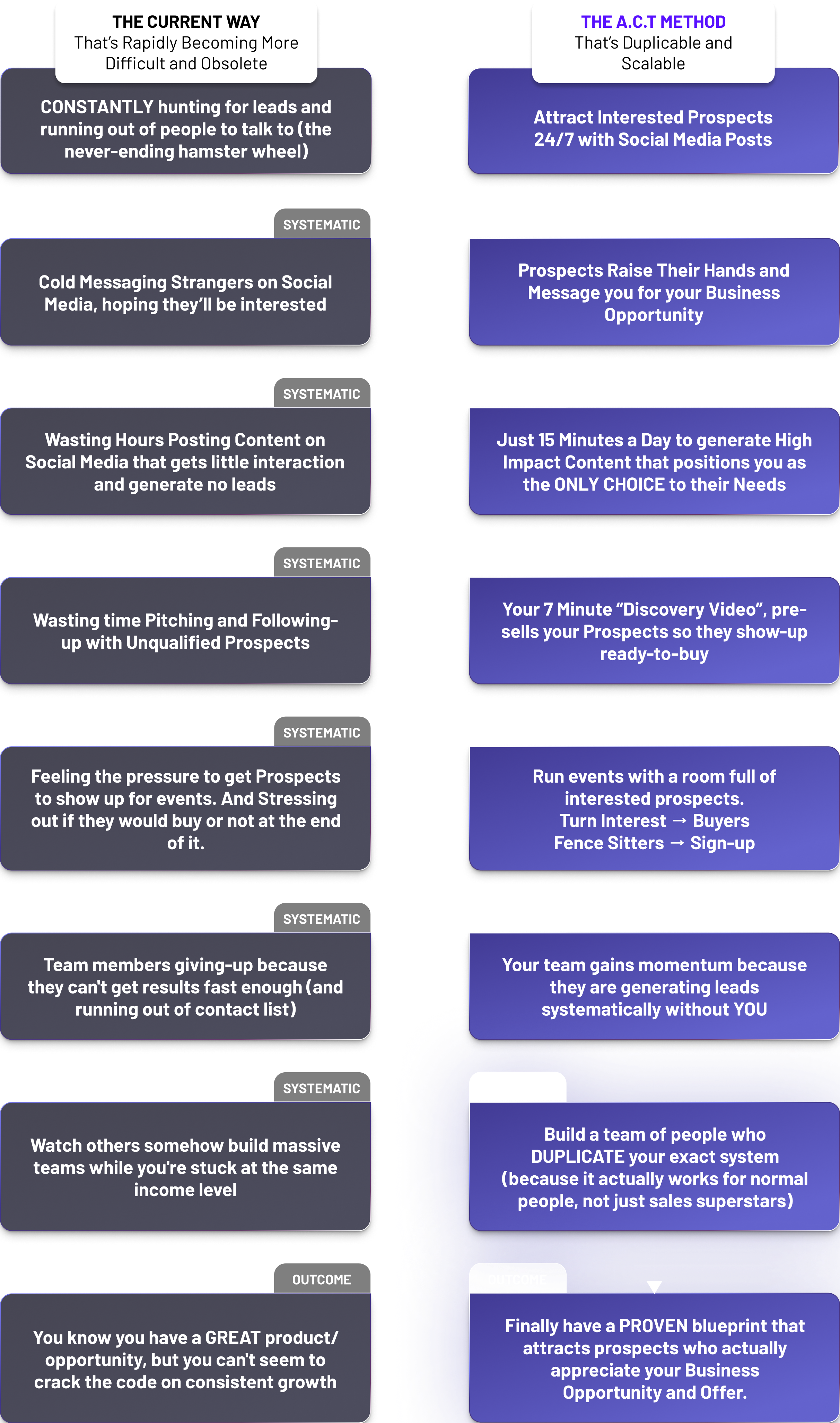 No more cold calling. No more chasing. No more rejection. No more driving to meet defensive prospects. Or begging people to join your events.