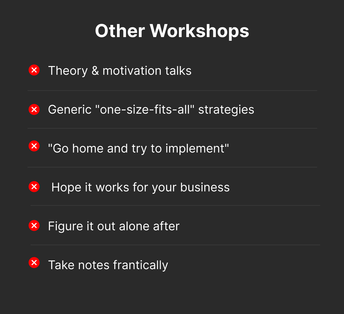 No. This is a working workshop. You'll be on your device, using the tools, building your systems. You leave with everything DONE and WORKING, not just inspired.